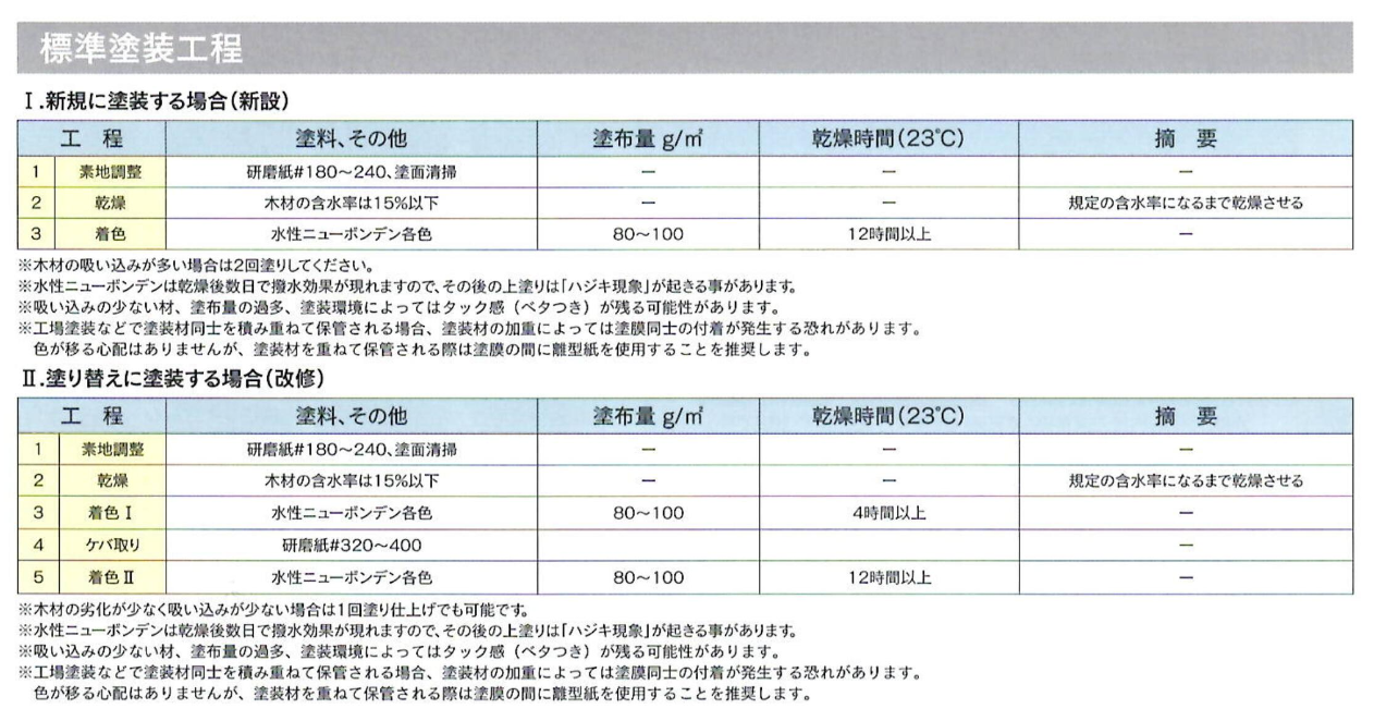 ・水性ニューボンデン「レジューサー」単独での外部への仕様は着色仕上に比べ耐候性が落ちるため、避けてください。